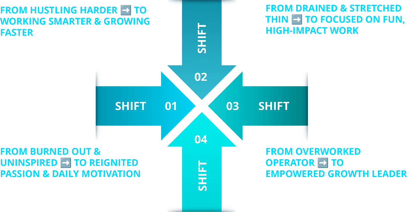 Marshall has coached thousands of entrepreneurs to stop drowning in the day-to-day grind, reclaim their role as visionary leaders, and fall back in love with their business again. His approach isn’t about fluffy theories or cookie-cutter strategies. He delivers clear, practical, executable steps that create real results.